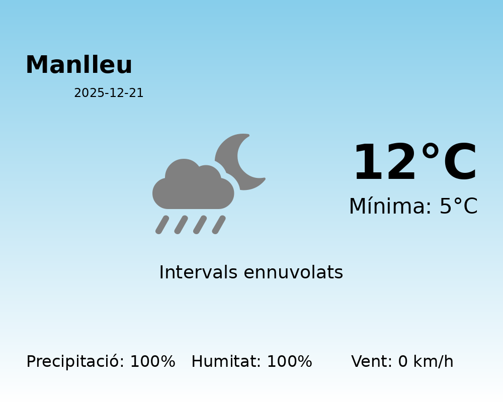 Benvinguts a la predicció meteorològica per a la ciutat de Manlleu. Avui, 21 de desembre de 2025, s’espera un dia amb condicions climatològiques adverses.
