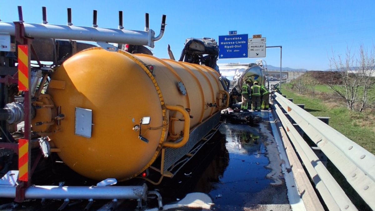Segons han informat els Bombers, un dels camions que transportava purins ha bolcat, mentre que un altre vehicle que transporta llet ha patit una fuita a la cisterna. Els serveis d’emergència estan transvasant el contingut a una altra cisterna per poder retirar el vehicle amb seguretat.