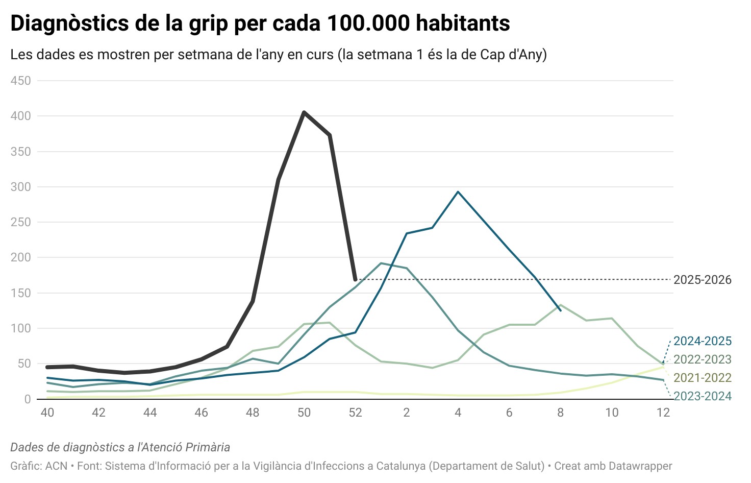 ACN Barcelona – La incidència estimada de la grip baixa de 546 casos per 100.000 habitants a 236 en una setmana, segons les últimes dades del Sistema d’Informació per a la Vigilància d’Infeccions a Catalunya (SIVIC). Les dades del 22 al 28 de desembre, actualitzades aquest dimarts, mostren un descens marcat dues setmanes després d’arribar al pic de contagis, que es va situar en una taxa de 759, a les portes de les festes de Nadal. Els casos diagnosticats han passat de 374 a 169 per 100.000 habitants i el nivell de transmissió se situa per sobre del llindar moderat. En nombres absoluts, s’han diagnosticat 13.692 casos, pels 30.362 de la setmana anterior. En el pic, es van fer 33.078 diagnòstics, molt per sobre i abans que els anys anteriors.