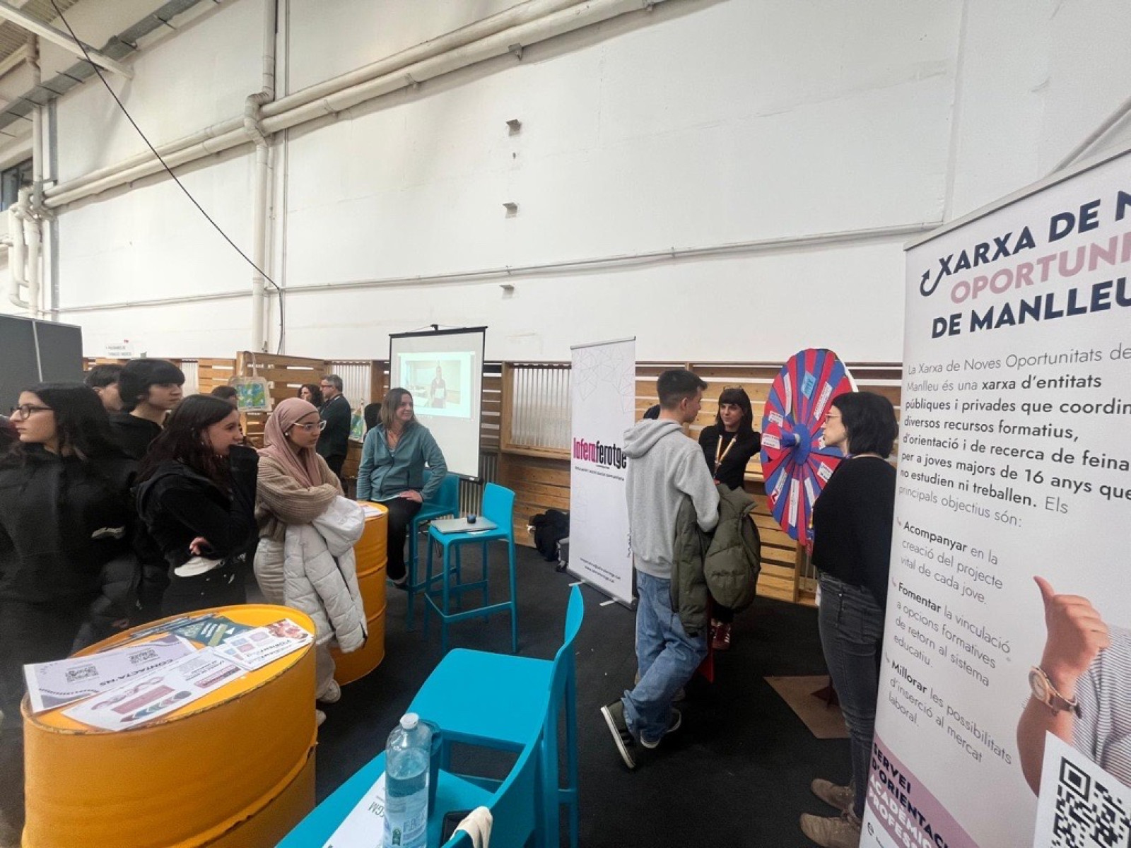 Per atrapar l’atenció dels assistents, s’ha organitzat un joc dinàmic amb una ruleta d’orientació, que proporcionava informació sobre els diferents recursos disponibles a Manlleu. Els joves que encertaven les respostes tenien l’oportunitat de guanyar una bossa amb el lema “Estic orientant-me, no molesteu”. Aquest format divertit va ser dissenyat amb la col·laboració dels joves participants del programa “Manlleu t’acull”, que van contribuir a la creació de preguntes per a fomentar l’ús del català.