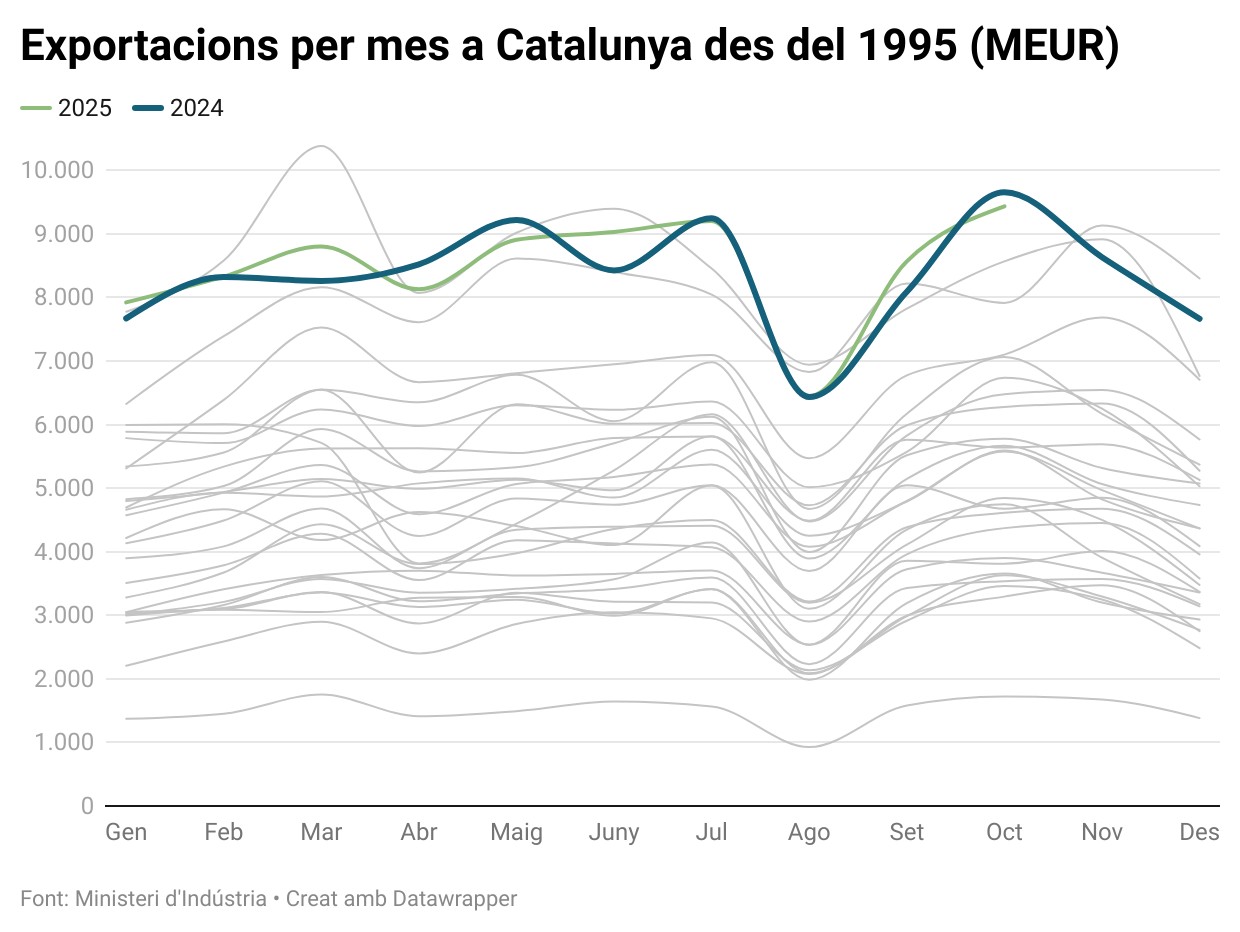 És la quarta vegada aquest 2025 que les exportacions presenten un valor negatiu interanual, després dels mesos d’abril (-4,6%, fins a 8.128,2 milions), maig (-3,4%, amb 8.906,3 milions) i juliol (-0,5%, fins a 9.201,4 milions).
